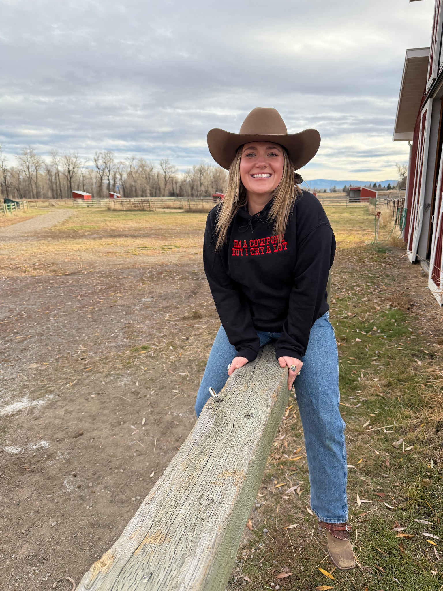 Howdy! This hoodie is black with red embroidered lettering - perfect for the emo-cowgirl in all of us! Design made and embroidered by WolfCreekCowgirlCo.